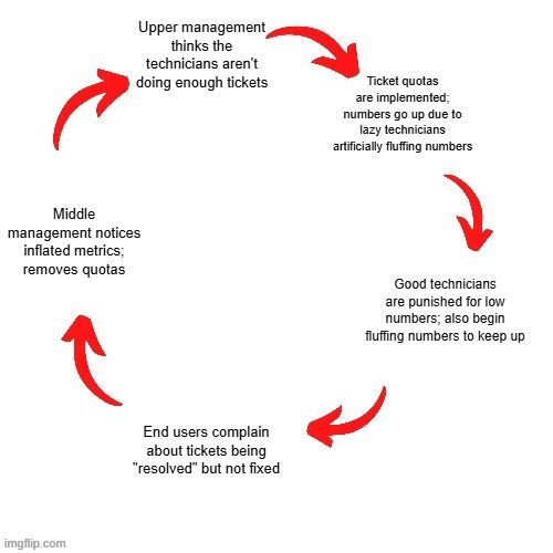 Tickets are an integral part of any IT technician’s day. But there is a prominent issue in every IT department with the use of ticketing systems: quotas. The day ticket quotas are implemented is the day the quality of the IT department goes downhill. I have seen it happen many times before. While I understand why some metrics are in place (ensure tickets are resolved in a timely manner, and which systems are having the most problems), having a hard quota usually backfires in a frustrating and cyclical way.