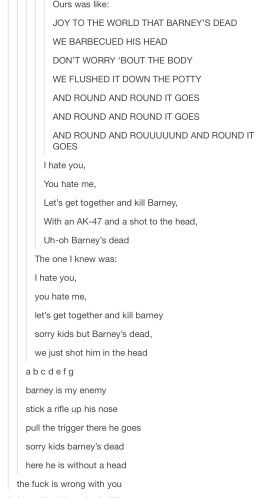 But, I digress. This little ditty brought me back to when I was a kid, singing songs about Barney being violently dismembered in the cafeteria with my friends. Then I wondered, “Why? I liked Barney when I was 5. ‘And The Green Grass Grew All Around’ was my favorite song from the show. Why was I so on board with wanting Barney to get decapitated when I was 8?” Personally, I didn’t hate Barney; I just stopped watching it. I only went along with the songs because I thought they were funny.